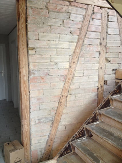 Eine alte Treppenhauswand mit schlechter bausubstanz.